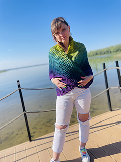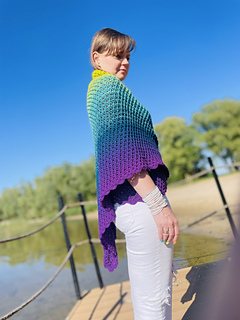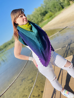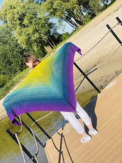My version was made with the lovely Sweet Ombre Merino yarn (50% merino, 50% acrylic), 4-ply, approx. 2200 m used. The finished shawl measures around 100 x 200 cm – perfectly sized to wrap yourself in softness and charm.