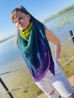 Moja wersja powstała z cudownej włóczki Sweet Ombre Merino (50% merino, 50% akryl), 4 nitki, zużycie ok. 2200 m. Gotowa chusta ma wymiary około 100 x 200 cm – czyli otula naprawdę pięknie.