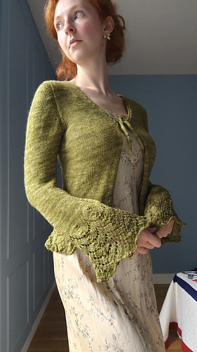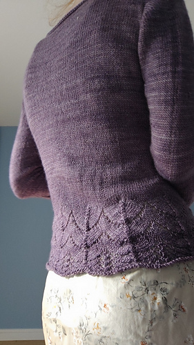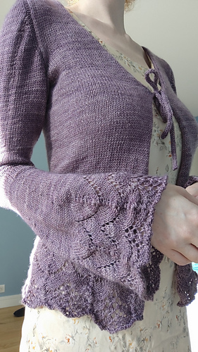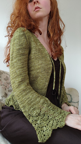 The Circe Cardigan is knit top-down, beginning with the back piece. Two front pieces are picked up and knit flat, one at a time. Once both front pieces have reached the underarm level, all three pieces are joined and knit flat. A lace hem detail is worked beginning at the lower waist. Set-in sleeves are added, then shaped into bell sleeves with a matching lace detail. Finish it off with i-cord lace ties, and voila, your Circe Cardigan will be ready to wear.
