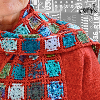 This striking crochet scarf blends airy fingering-weight drape with bold geometric flair, featuring two-colour square motifs that echo the clean lines and playful complexity of an abstract circuit board. Each motif creates a pop of contrast—sharp intersections, tiny pathways and rhythmic grids—coming together in a design that feels modern, tech-inspired and effortlessly wearable. The lightweight yarn lets the fabric drape beautifully while still showcasing every crisp detail of the pattern. The use of back post stitches gives the finished fabric an extra squishy depth.