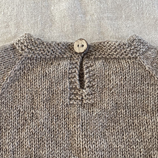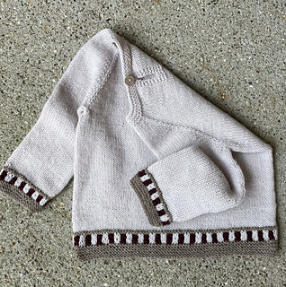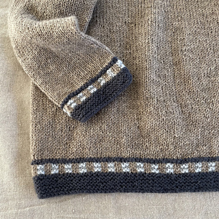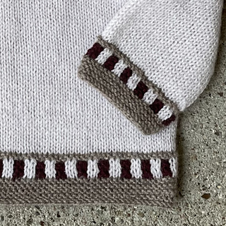 Circus Sweater Mini is a classic, timeless sweater. The sweater is worked top down in stockinette stitch with long sleeves. At the neck a slit is worked that is closed with a small button. Body and sleeves are finished with a pattern in contrasting colour and the Fair Isle technique, followed by edges in garter stitch. The neck is shaped with German short rows.