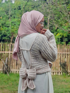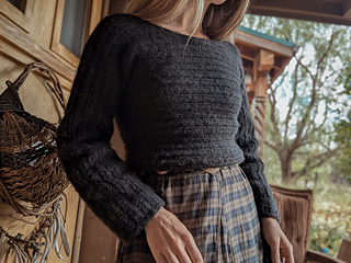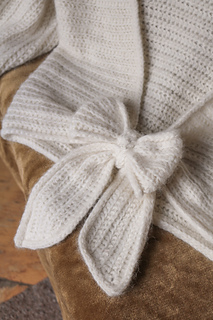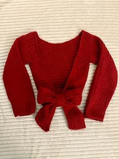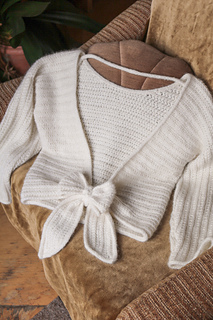 The sweater is constructed seamlessly from the top down. The sleeves are shaped using simple decreases, and the main body is worked in continuous rows before the back tie is added. The pattern includes notes for customizing the length and sleeve length and options for either tying or permanently sewing the back bow.