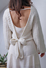 The Claire Sweater is an elegant, cropped wrap sweater featuring a delicate texture and a stunning open back that ties at the waist. It has a modern boat-neck, gently tapered sleeves and a back opening. This piece is perfect for layering over a dresses or camisole for a romantic, everyday style, or as a sophisticated piece for special occasions.