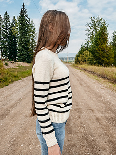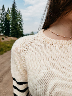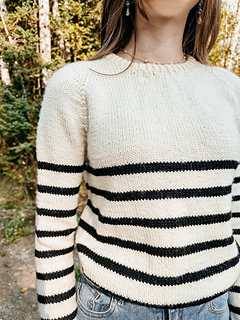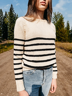 A classic, top-down raglan with a beautiful airy drape and clean lines. Optional stripes, folded or regular neckband, and a relaxed DK gauge for a soft, wearable finish.