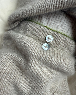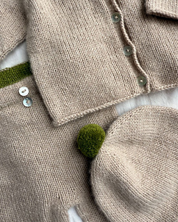 The beige Cleo Baby Set is knitted in Cashmere by Sandnes Garn in the colors Beige melange [3021] og Matcha [9564].