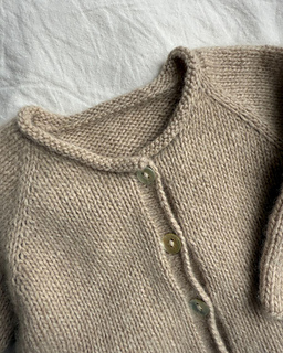 The cardigan is worked from the top down with raglan increases. The cardigan has rolling edges in stockinette stitch. The stockinette stitch front plackets are worked at the end as well as a stockinette stitch neck edge.
