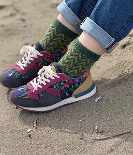 The Cleone Socks are knitted from the cuff down with a chart for the color work and finished with a kitchener stitched toe. It is a simple pattern easy to follow and memorize. It is written for adut small, medium, and large sizes.