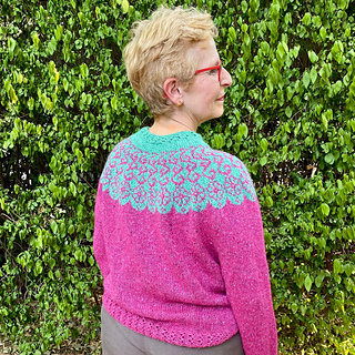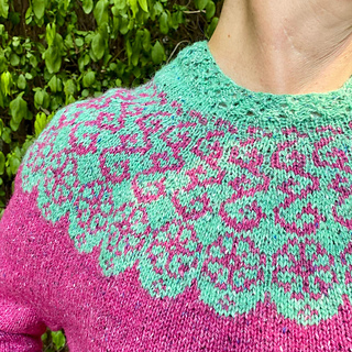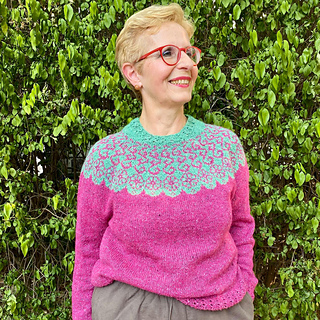 Da brava ex pittrice sono molto influenzata dai colori. Sono talmente importanti per me che alcuni “dominano” letteralmente le stagioni della mia vita. Se penso alla mia infanzia, per esempio, la associo al bianco e all’arancione, la mia giovinezza è dominata dal viola e ora sono in un periodo dove alterno il grigio-beige al verde brillante. Ed è proprio questa tonalità, associata al suo esatto contrario, ovvero il rosa, ad ispirare la creazione di un capo di abbigliamento unico: mi fa venire in mente un grande fiore meraviglioso che diventa il motivo decorativo di questo maglione colorato e molto femminile.