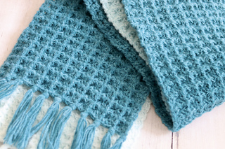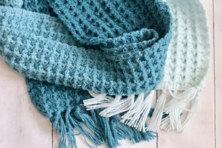 Yarn: Caron Cloud Cakes ® by Yarnspirations ® (100% Polyester; 227 g/8 oz; Approx. 720 yds/658 meters). Medium (4). Colour Shown: Lagoon. You will need 1.5 cakes to complete the scarf.