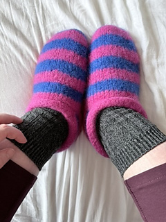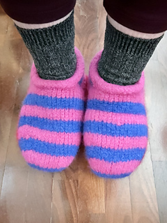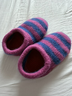 The slippers are constructed in panels (Right Foot + Left Foot) and then felted in the washing machine to achieve a snug and durable fit.
