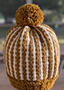 The hat has a ribbed cuff, pompom, and is knit with the mosaic motif called “”Three-and-one-Tweed“”. Detailed instructions for mosaic knitting are included.