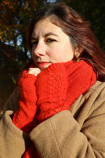 The Coati mitts are a quick knit on 4.5 mm needles. They feature the lace motif on the top, while the rest is in stockinette stitch. They’re topped with a few centimeters of 1x1 ribbing for a neat fit. They’re worked from the cuff up, allowing you to try them on as you go. Whether worn alone or as a set, they promise plenty of warmth for the winter.