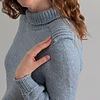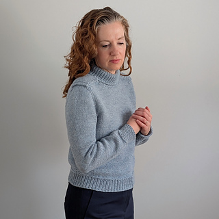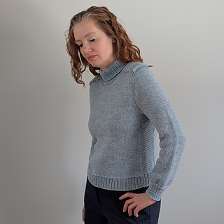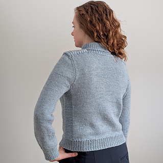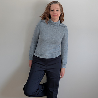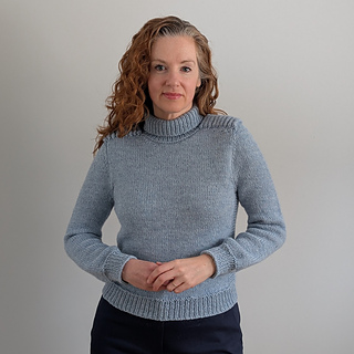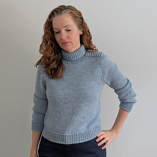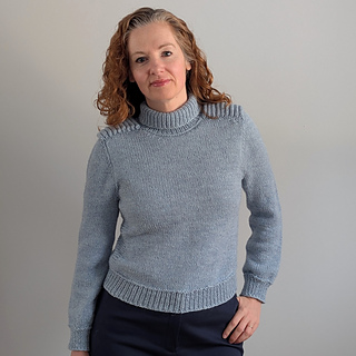 Cold Shoulder is a top down pullover. The shoulder saddles are knit first and then the stitches are put on hold. The fronts and backs are picked up from the edges of the shoulder saddle, and the sleeves are knit across the saddle stitches previously put on hold. Short rows are used to complete the shoulder shaping for the front and back. The yoke is worked in the round. The sleeve stitches are put on hold while the underarm stitches are cast on. The body is continued in the round down to the hem ribbing. The sleeves are returned to the needles, and knit from the underarm down to the cuff. The turtleneck collar is picked up from the neckline edge.