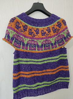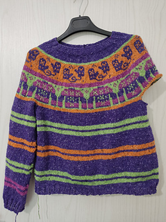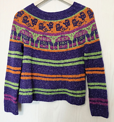 This sweater is worked seamlessly from the top down. Short rows are added to shape the neckline and the stranded yoke is worked. The sleeves and body are separated and worked in the round.