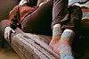 These socks are knitted top down, using 20g of 4 different colours of sock yarn, named A through D, with a colour work detail before each colour change.