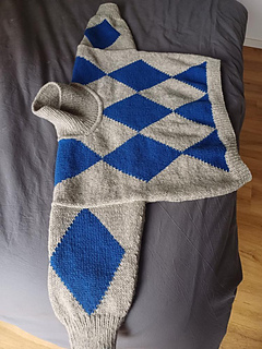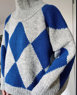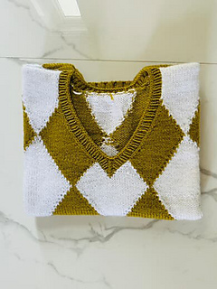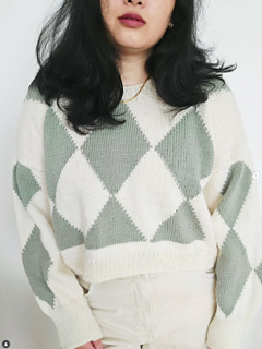 The Colman Diamond Sweater is worked flat for the body and sleeves, with the ribbing hems done in the round. Knitting flat is ideal for intarsia such as in this pattern. First, you cast on for the back neck and knit top-down. Then you pick up stitches for the front, shaping the right and left shoulders for either a crew neck or v-neck option. These pieces join to make the front body which you continue flat top-down. The top-down construction is to allow you to try on the sweater as you go, so you can achieve exactly the fit you want! The sleeves are picked up and knit flat. Then the front/back and sleeves are seamed together. Finally, you pick up stitches in the round for the collar, body hem, and sleeve hems, knit in 1x1 ribbing and bind off in the round.