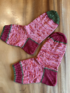 First sample (pink): Hue Loco Merino sock in Apricot (MC), Currant (CC1) and Unnamed Pink (CC2).