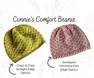 Connie’s Comfort Beanie is a design full of rich texture. Once you decide on this pattern you still have a couple of options. Check out the brim-you can make it straight for a crisp and clean look or crochet a fun scallop for a more feminine flair.