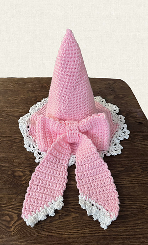 This is a tall, structured witch hat with a wide brim, lace edging, and a soft bow that drapes at the back. It has a feminine, coquette style and can be worn for costumes, cosplay, themed events, or everyday fashion.