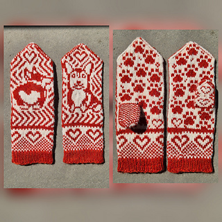 Mittens with cute corgis, with different pattern for the right and left mitten. Knitted in the recommended yarns the mittens and thick and sturdy, but they will also be beautiful in thinner yarn. Your choice, just watch your gauge!