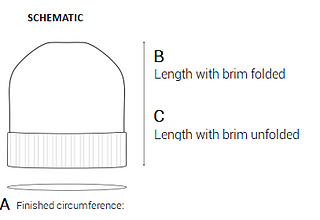 B Length: +/-8¼ (8½, 9¼) 9½)” high with brim folded 21(22.5, 23.5)24.5 cm.