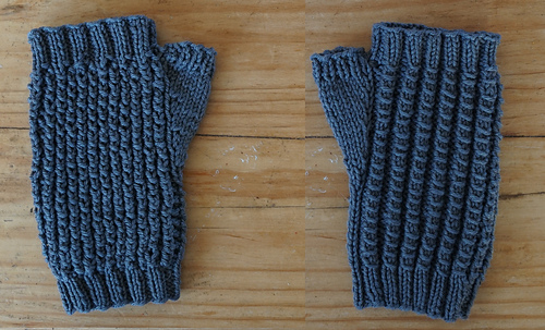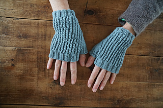 Mitts are worked in the round, seamlessly from the bottom up, in 1x1 & 2x2 ribbing with yarn over pass over stitches. The thumb gusset is worked in stockinette stitch and finished with 2x2 ribbing. Both mittens are worked in the same way.