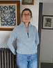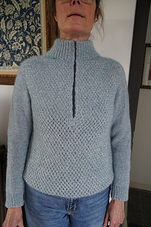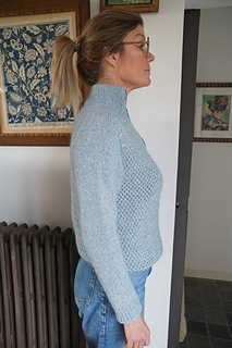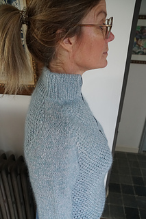 The sweater is worked seamlessly with two strands of yarn held together, you start working back and forth for the collar and the front split before continuing top down and in stockinette stitch and/ or pass over stitches for front s and back. With a zipper ribbed collar folded-over. this sweater has an elegant construction, due to modified contiguous saddle shoulders, short-row shaping to lower the front neckline. Two option for sleeves, gently balloon-shaped sleeves or classic sleeves with decrease underarm are proposed.