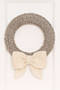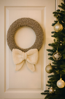 The wreath is knitted flat and sewn around a foam ring, and the bow is created separately with simple increases and decreases. No advanced techniques are required, and links to helpful tutorials are included.