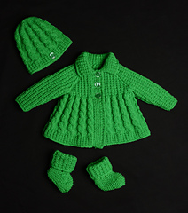 This is a Baby Knitting Pattern for a little Coat, Bobble / Beanie hat, Square style hat and booties to fit a baby 16’’ chest. It is made using DK yarn with 3.25mm & 4mm needles. You will need 200g of DK yarn to make the whole set.