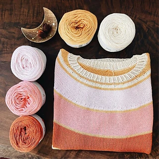 I used: Yarn Hobbii Twister Solid (55% Cotton, 45% Acrylic; 437 yds/400 m) in Cream (MC), Corn (CC1), Light rose (CC2), Flamingo (CC3) and Ginger (CC4).