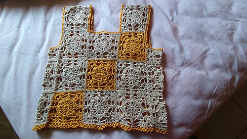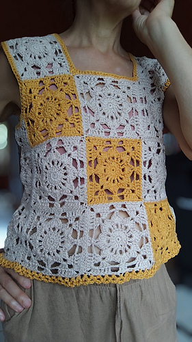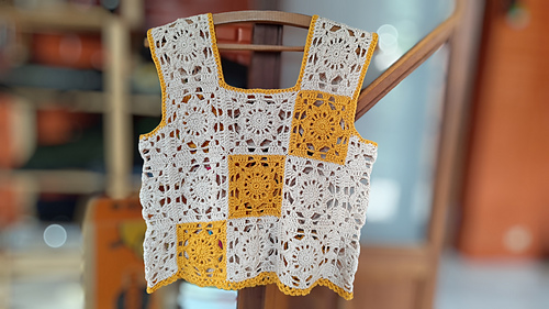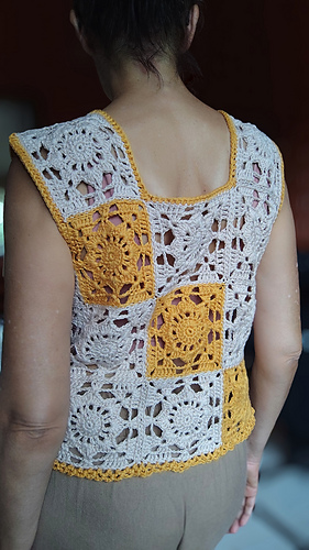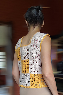 This garment is crocheted using 100% cotton yarn and is quick to make, constructed from a small number of modular squares. The design features a straight neckline that contrasts with the soft shaping of the armholes and hem.