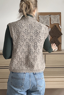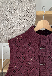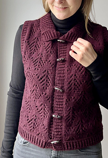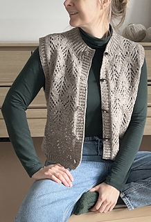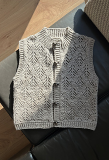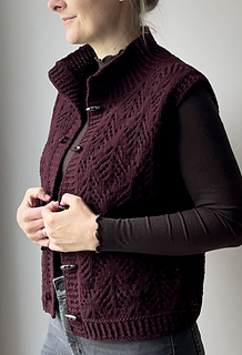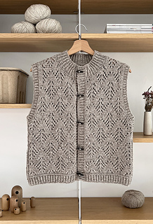 It is worked seamlessly from the top down using 4,5 4,0 mm needles. You‘ll begin by knitting the slanted back, then pick up stitches for the right and left fronts. The three pieces are then joined under the arms, and the body is finished flat. The length of the vest can be customized. Finally, the ribbing isadded using 3,5 3,0 mm needles. If desired, button loops can be crocheted and buttons sewn on.