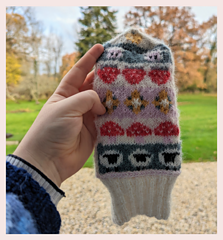 For these cosy, colourwork, made-to-measure mittens inspired by all things cottage core, you’ll need 50g of your main colour in a fingering/sport weight yarn, plus 15g each of 4 contrast colours, also in fingering or sport weight.