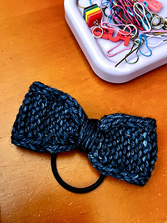 The bow is worked flat in garter stitch with a faux i-cord edge for a neat finish. You’ll knit the entire body first, stitch the ends together to form a loop, and then create the center of the bow while attaching it to an elastic hair band. It’s fully customizable in width and length—just keep in mind that changes will affect your yarn usage. Gauge isn’t critical for such a small project.