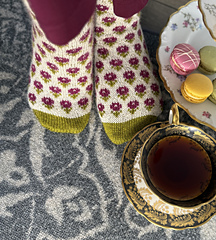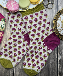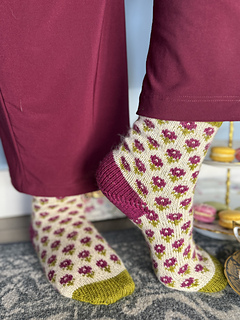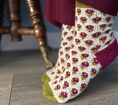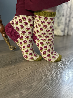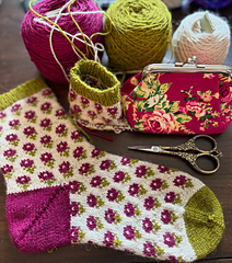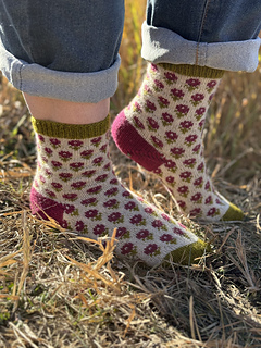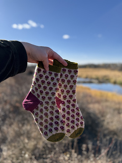 These socks are knit cuff down, increasing sts and changing needle size for the leg and foot to accommodate the less stretchy fabric of stranded knitting. This pattern is written for sock yarn and two different size needles. The heel is a German Short Row Heel and the toe is grafted together with Kitchener Stitch.