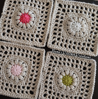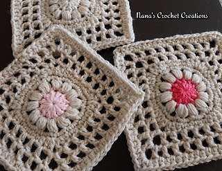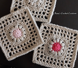 • Yarn used: Various worsted weight (4) colored scraps for the CENTER ROUNDS and Lion Brand Wool-Ease in “Natural Heather” for the SQUARES worked around the CENTERS.