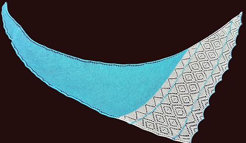 This asymmetrical shawl is knitted from one corner to the wide side in garter stitch and finished with lace patterns and a border. Its crescent shape and elongated corners allow it to drape beautifully around the neck.