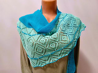 Эта ассиметричная шаль вяжется от угла к широкой стороне платочной вязкой и завершается узорами и каймой. За счет серповидной формы и удлиненных уголков шаль красиво драпируется вокруг шеи.