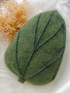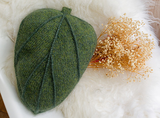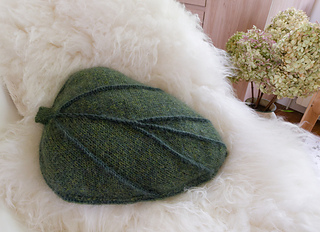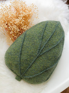 The body of the cushion is fully knitted, while the leaf veins are highlighted with crochet for added texture and detail.