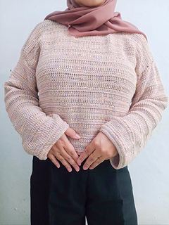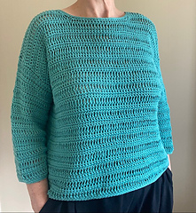 The sweater is constructed from the top down. You will begin by creating the full back panel. The front is then worked directly from the top edge of the back, shaping the neckline with simple increases before joining to work the panel down to its full length. After seaming the sides, the sleeves are crocheted and attached. The pattern is easily customized to your preferred body and sleeve length.