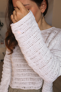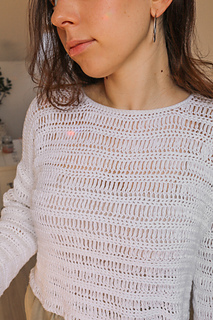The Cove Sweater is a light and airy crochet pullover with a modern look, perfect for transitioning between seasons. It’s a versatile layering piece with a beautiful drape and an elegant boat neckline. The unique stitch pattern creates a breathable texture that is comfortable to wear and engaging to crochet.