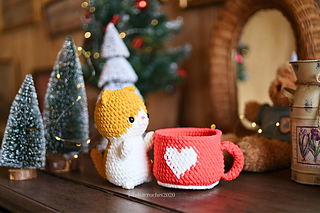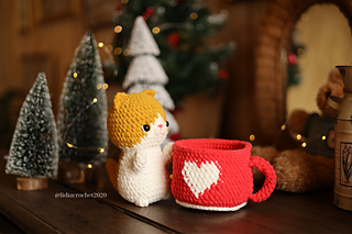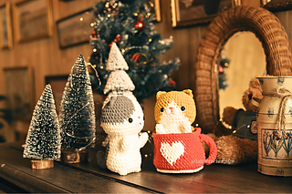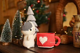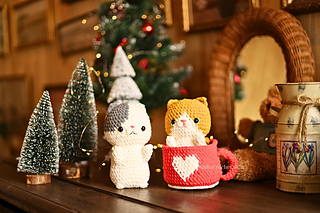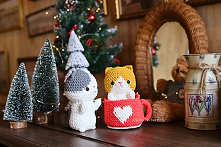 This pattern includes two adorable cats (white–yellow and white–gray) and one red mug with a heart — the perfect project for your festive amigurumi collection or a handmade gift for cat lovers.