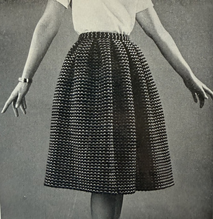 Measurements: To fit a 24 to 28 inches across patterned waist; completed length without waistband, 24.5 inches (adjustable); width round lower edge, approximately 2 yds.