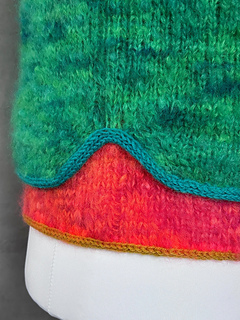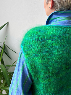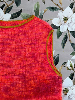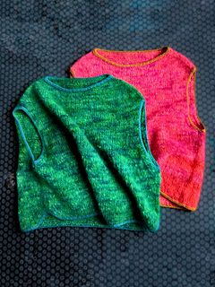 The vest is worked seamlessly in the round from the top down. After shaping the boat neckline and shoulders using short rows, the front and back are worked separately in rows. To finish the armholes, the stitches are joined again and the body is worked in the round down to the hem.