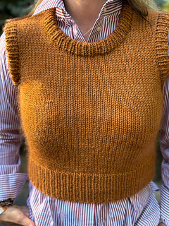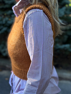 Charming and soft, Cozy Prep is a cropped vest with subtly shaped cap shoulders. It’s worked in the round to the armholes with minimal finishing. The hemmed neckline and armhole details add a sophisticated finish to this cozy layering piece.