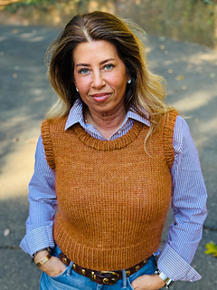 Christina’s gold vest is made in the Clay colorway; Shaina’s is made in the Hot 2 Trot colorway.
