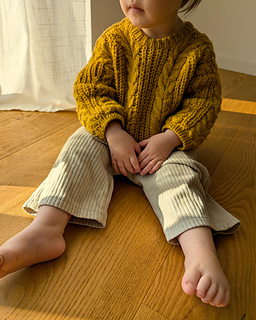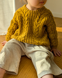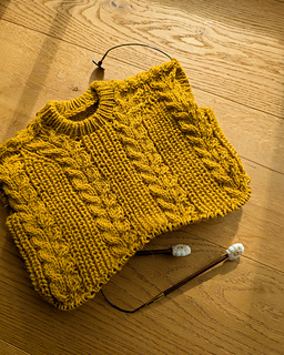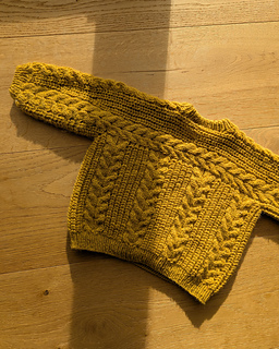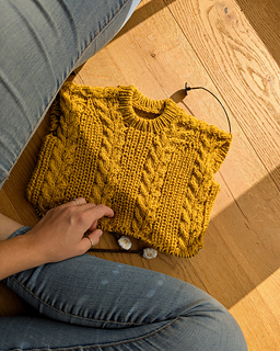The Cozycottagesweater is knitted seamlessly top down and worn oversized for a casual and comfy fit. The sweater is knitted with a back yoke that is continued in the sleeves. The pattern combination of cables and half brioche stitch make this one a cozy statement piece that will keep you warm and is a match to almost everything. The sweater has a pretty crew neck and the neckband is worked in single rib pattern.