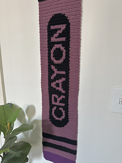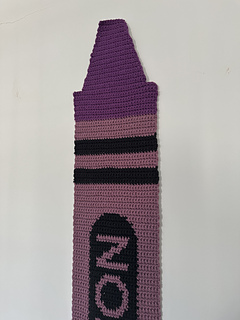 The piece uses worsted weight yarn, approximately 115 yards for the crayon color, 210 yards for the wrapper color, and 20 yards of black for the details. The finished crayon measures 8“ wide x 49” tall.