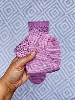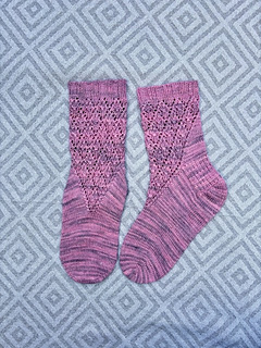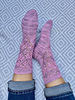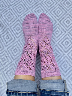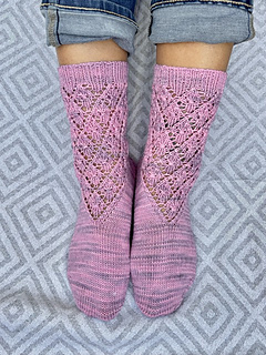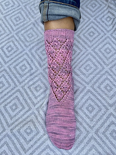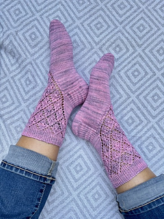 CRAZY DIAMONDS socks are knit toe up with an interesting diamond shaped lace motif expanding from the middle of instep and wrapping around the leg, creating a beautiful flow. The pattern works best with solid or semisolid yarns.