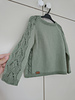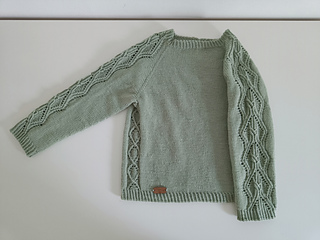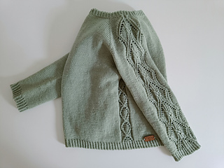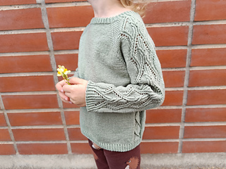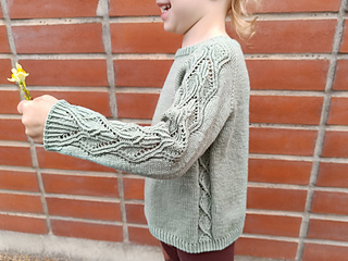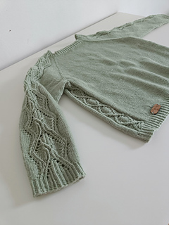 The creepers sweater is knitted seamlessly top-down. It has lace and cables on the sleeves and sides of body.